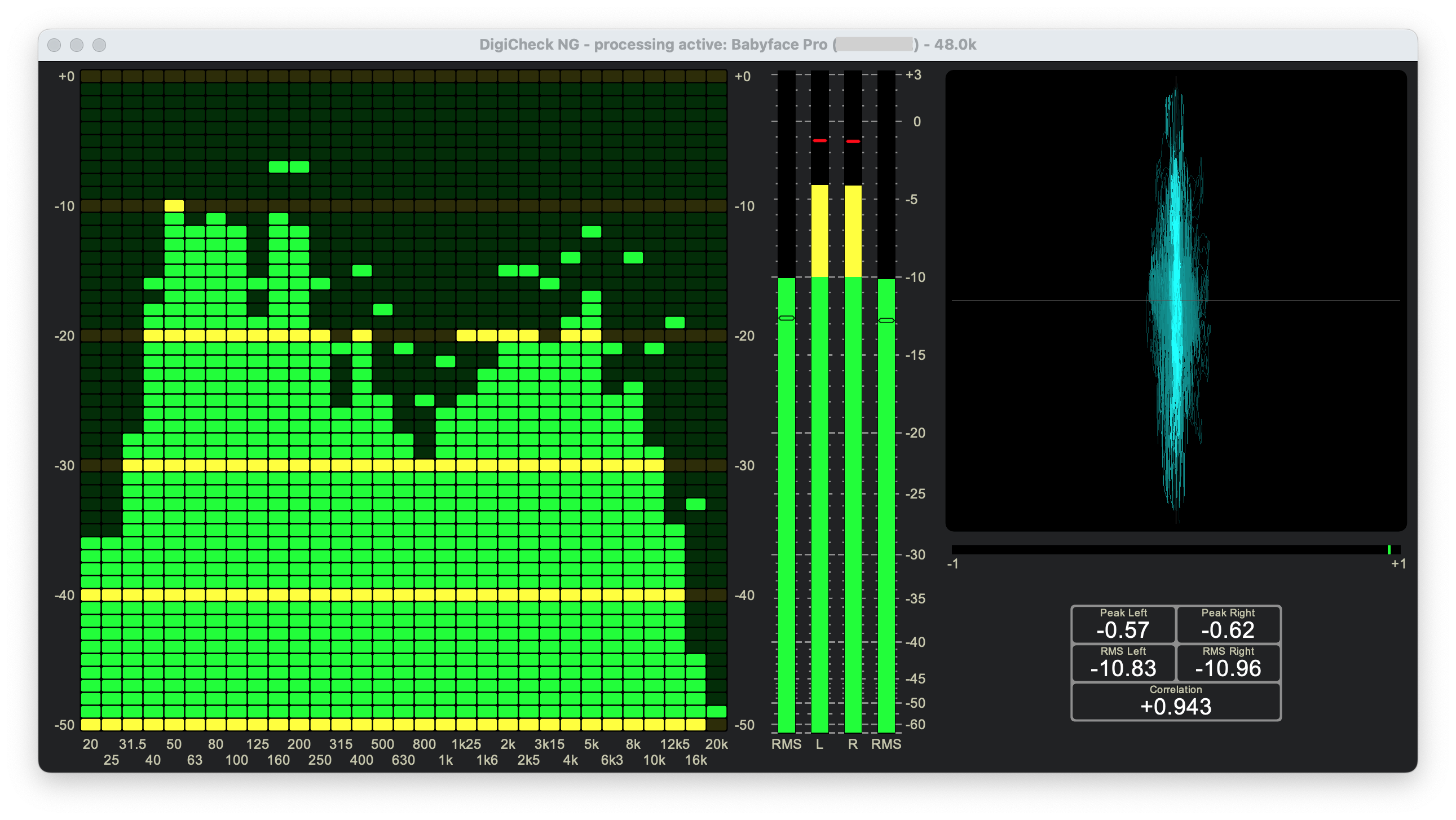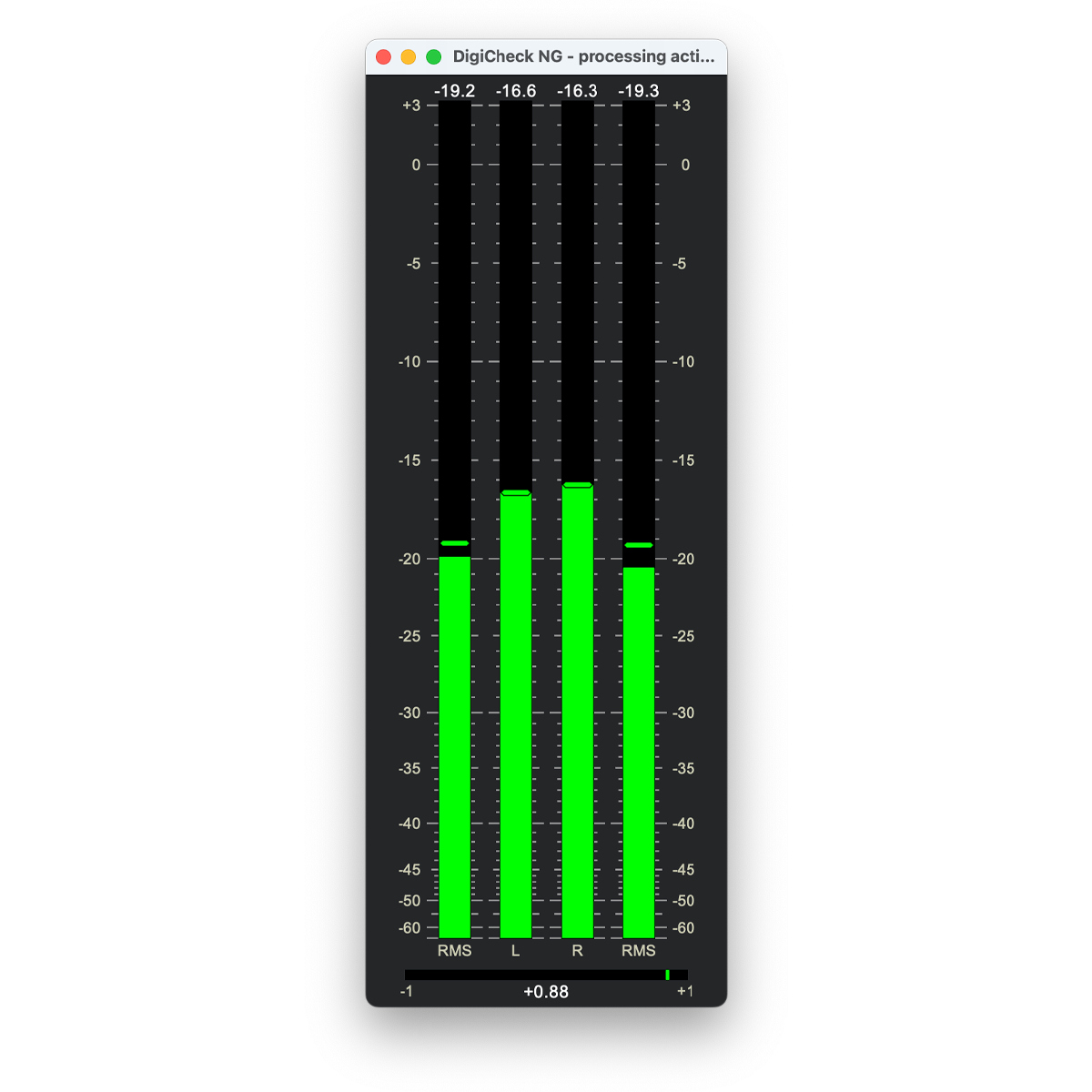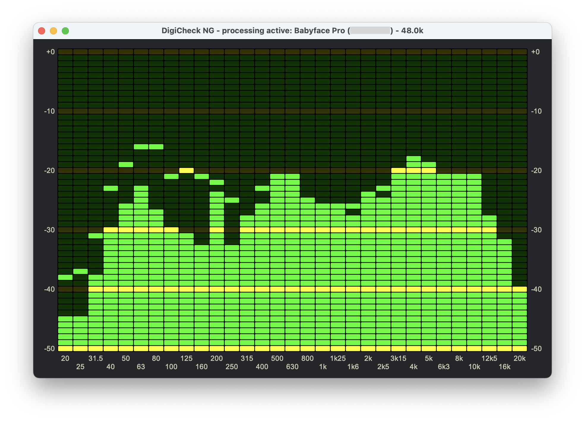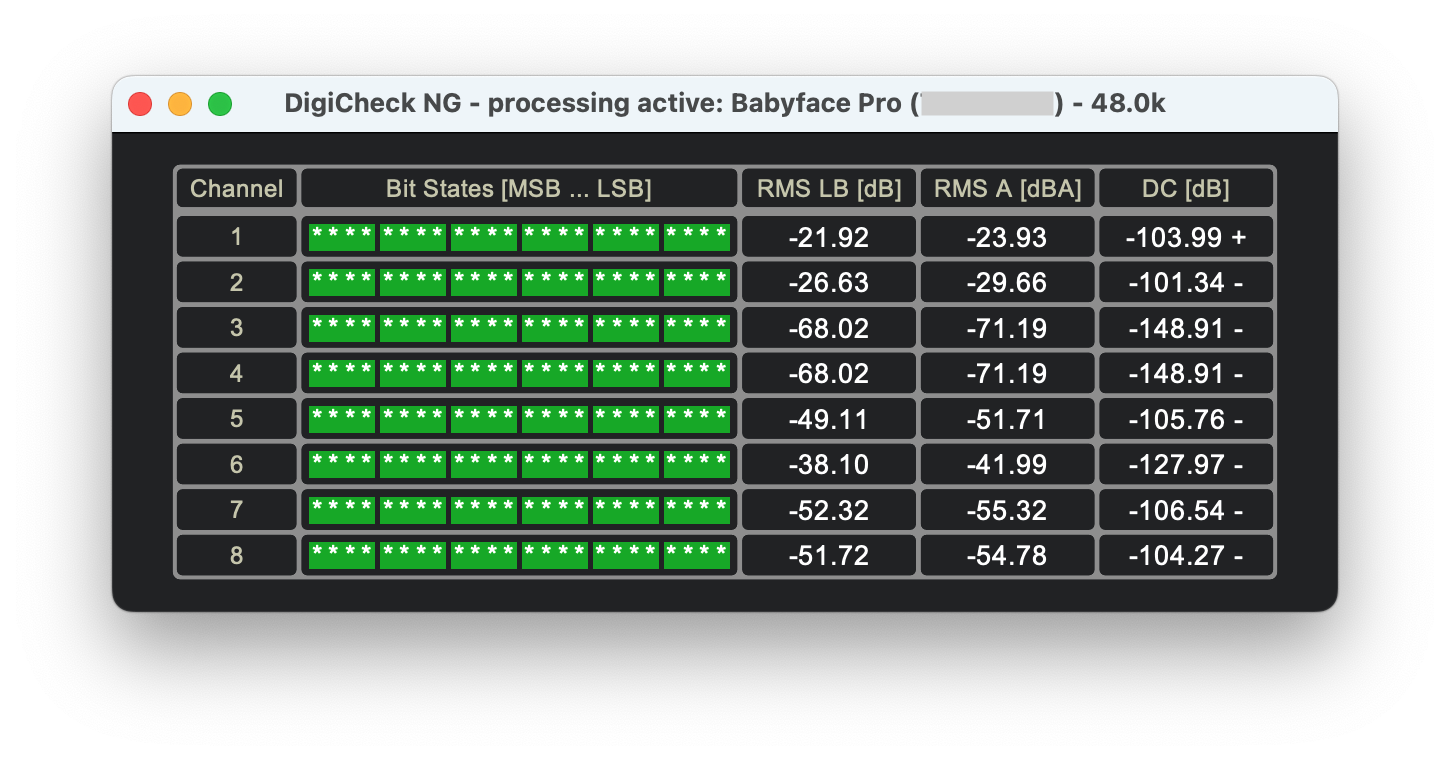 ビット統計は、オーディオデータの各ビットが変化しているか(緑色の「*」記号)、固定値(0または1)のままかをビットごとに示します。ビットはCoreAudioから提供される32ビット浮動小数点データから変換されます。これには23ビットの仮数部と符号ビットがあり、-1.0 fから+1.0 fの範囲で24ビットの整数として正確に表現でき、これは現在のほとんどのオーディオおよびデジタルインターフェースの解像度に対応します。