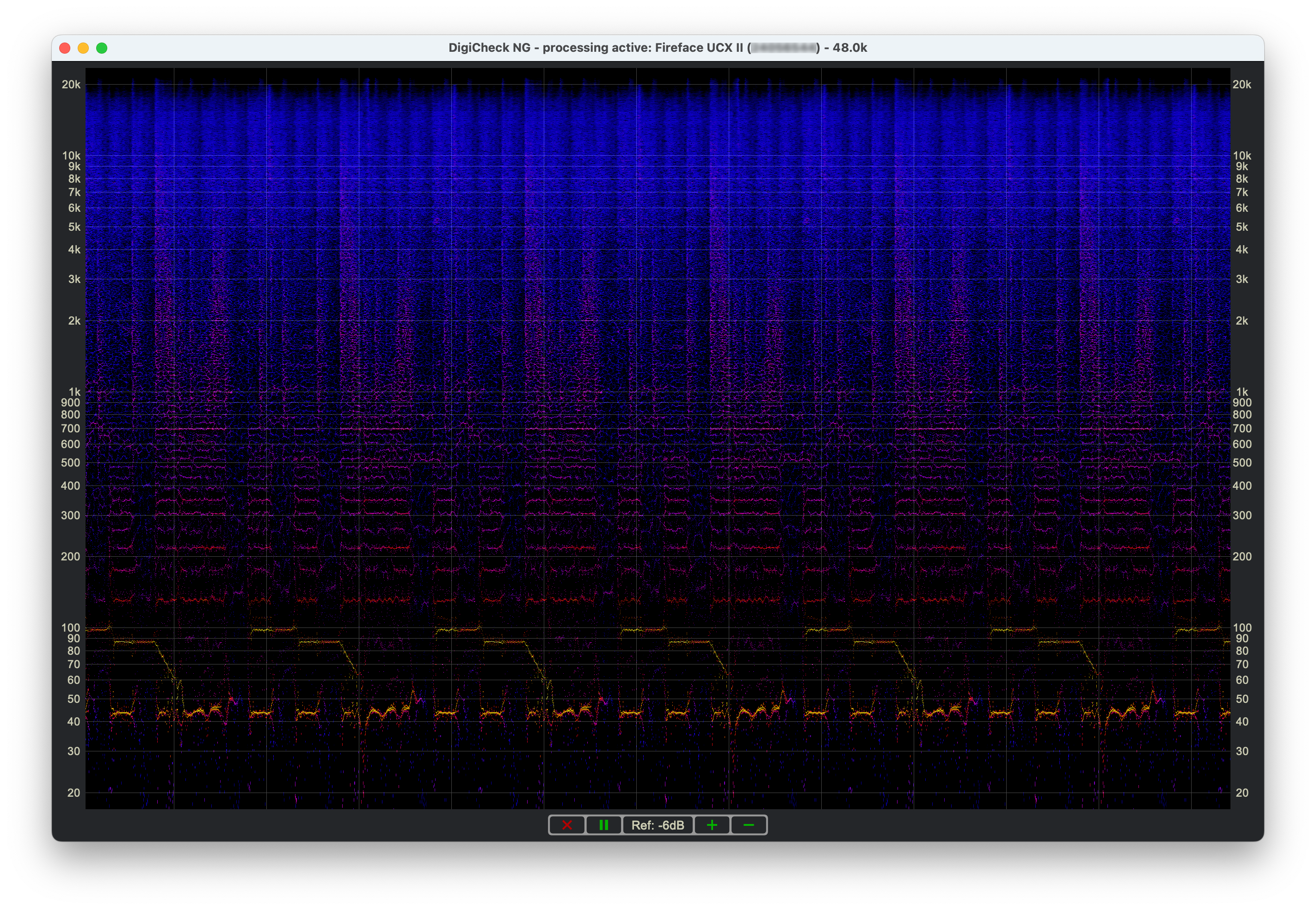 一般的なFFTの特徴として、信号強度が測定される周波数は線形に分布します。FFTのサイズ、つまり測定ウィンドウが長いほど周波数分解能は高くなります。低周波数で良好な分解能を得るには本来大きいサイズのFFTが必要になりますが、これは時間分解能を著しく低下させます。これに対処するリアサインメントは、連続的に実行されるFFTから追加情報を抽出し、FFTをより鮮明化します。このスペクトロスコープでは、Patrick Flandrin、François Auger、Eric Chassande-Mottinによるアルゴリズム(論文「Time-Frequency Reassignment: From Principles to Algorithms」2017年)を基に、連続測定と高解像度グラフィック用に改良を加えています。このアルゴリズムは非常に優れていますが、すべての問題を完全に解決できるわけではありません。FFTサイズを極端に小さくすると、表示は多少の劣化があります。特に合成された低周波信号(最も強くシャープ化される領域)では、アーティファクトが現れることがあります。最終的に、どの設定が最適かは用途に依存するため、ある程度の試行錯誤が必要です。また、リアサインメントはFFTサイズに応じて、表示に多少のレイテンシー(遅延)をもたらします。