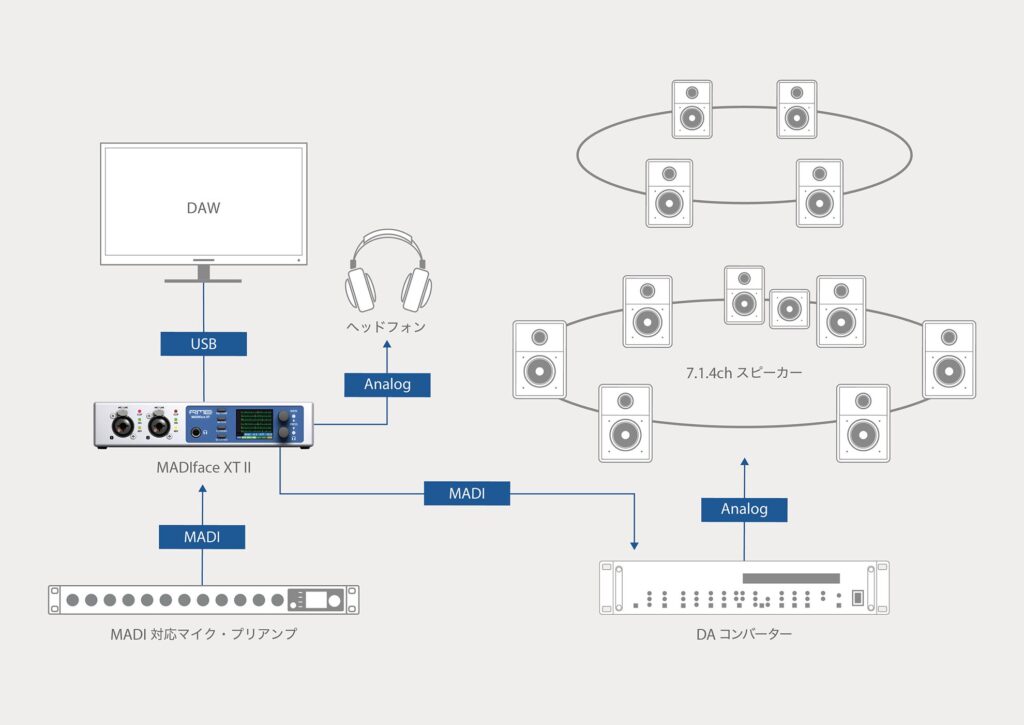MADIface XT IIは、MADI入力/出力をどちらも利用することにより、イマーシブ・オーディオのリアルタイム録音/再生が可能です。