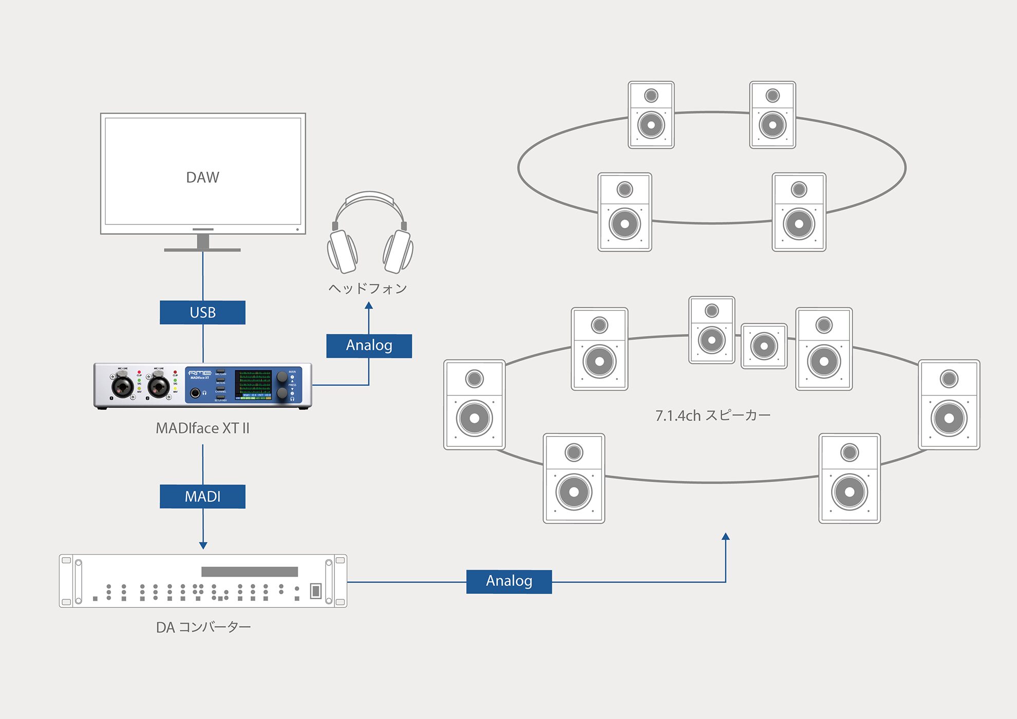 MADIface XT IIは、MADI入出力を3系統(オプティカル × 2、コアキシャル × 1)備えているため、一般的なDolby Atmos(7.1.4ch、5.1.4ch)からNHK 22.2chなど、あらゆるイマーシブ・オーディオフォーマットに柔軟な接続性で対応できます。DAWなどからの信号ソースは、MADIface XT IIからMADIケーブル1本のみでDAコンバーターに接続され、スピーカーへと出力されます。