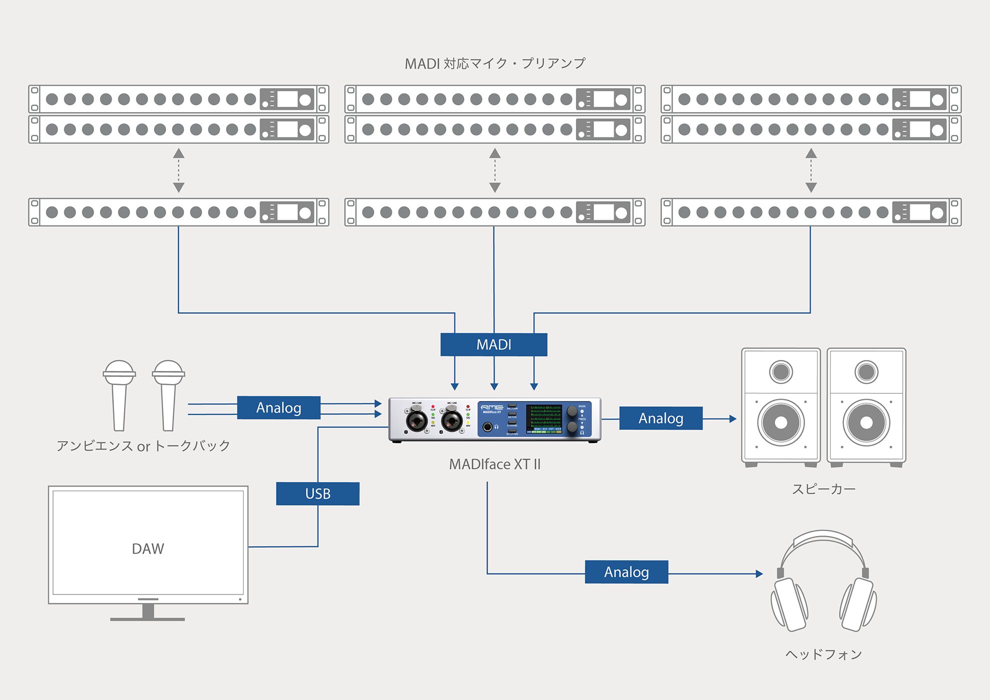 MADIface XT IIは、MADI入力/出力をどちらも利用することにより、イマーシブ・オーディオのリアルタイム録音/再生が可能です。