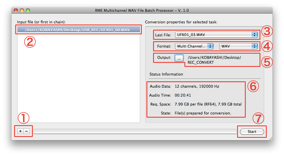 例)「UFX01_00.WAV」から「UFX01_03.WAV」までの連続した4つのファイルを処理する場合、①では最も番号が小さい「UFX01_00.WAV」を追加します。そして、最後となるファイルには「UFX01_03.WAV」を指定する事で、UFX01_00.WAV > UFX01_01.WAV > UFX01_02.WAV > UFX01_03.WAVの順番で1つのファイルへと処理されます。