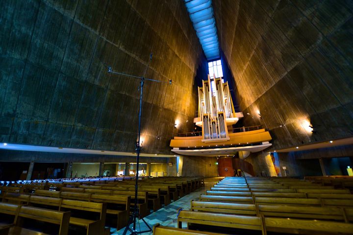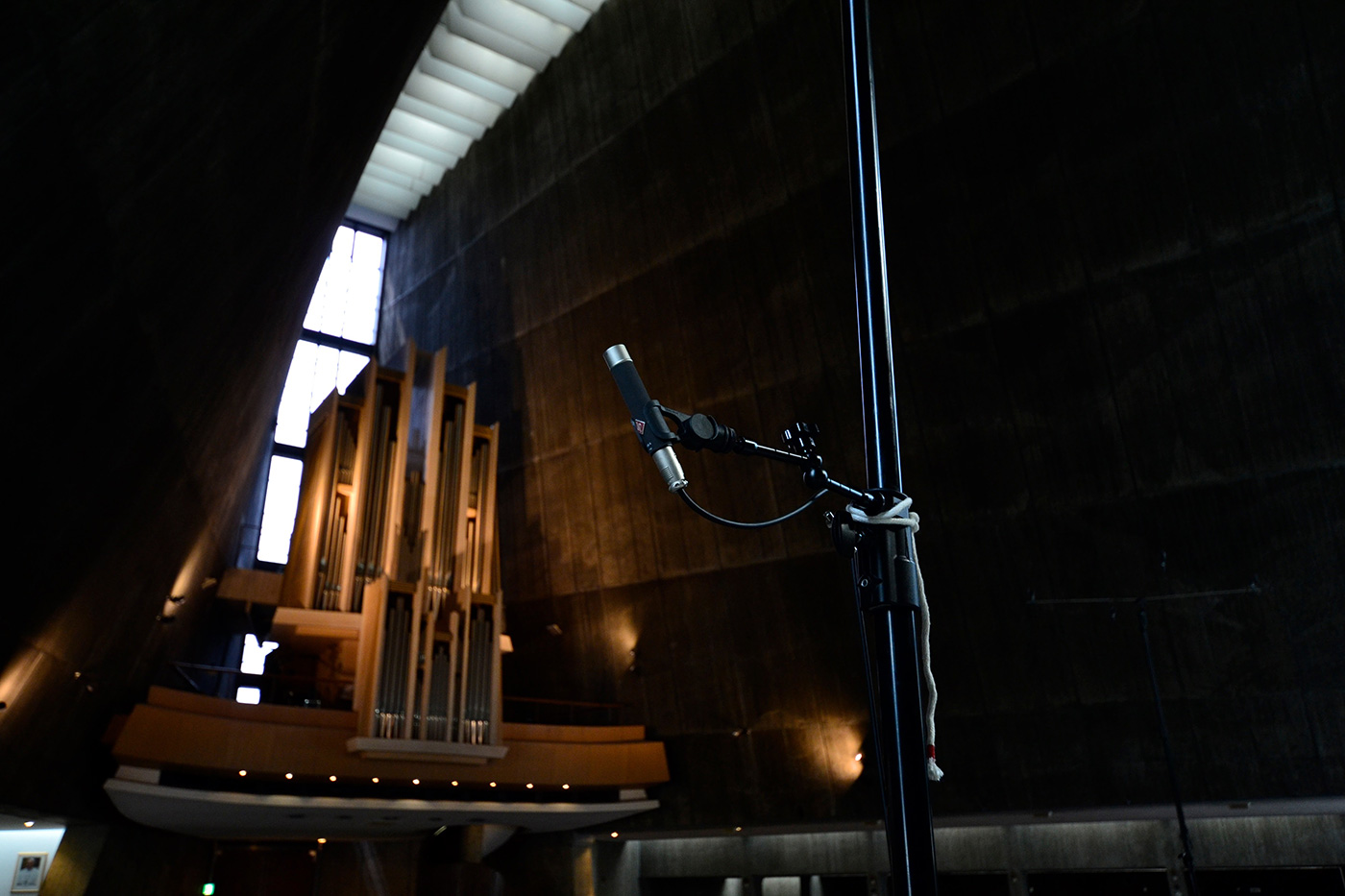 ミッド・レイヤー用のアンビエンス・マイクは、サイド・マイクとして2本のハイ・スタンドの脇から、天井の左右方向を狙った2本、そして、リア・マイク客席後方の2階に設置されたパイプオルガン席に2本配置。これらのマイクにはNeumann KMA131を用いた。(この4本のみがアナログ・マイク)