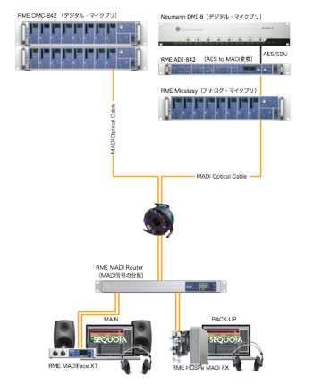 RME DMC-842とNeumannのDMI-8はデジタル・マイク・プリアンプとなっており、すべてのデジタル・マイクは、これらのマイクプリへ直接AES/EBUケーブルによってデジタル接続。デジタル・マイクはマイクロフォン上にてAD変換を行うため、通常のアナログ・マイクに比べ信号の劣化が少なく、非常に低ノイズでクリアな音質での収録が可能なため、今回の収録にも多数使用した。なお、すべてのマイク・プリアンプはMADI接続(オプティカル・ケーブル使用)されているが、NeumannのDMI-8はAES/EBUでの出力となるため、RME ADI-648にてAES/EBUからMADIへと信号を変換を行った。なお、ステージ脇に設置されたマイクプリ群から、録音用のMADIインターフェイスとPCが置かれた場所までは、距離にして30m程離れているため、その間はMADIオプティカルケーブルを使って接続。ちなみに、使用したMADIのオプティカルケーブルはドラムタイプで、4本のオプティカルケーブルが1本のケーブルにまとまっているため、32チャンネル分の信号を上記の配線図のように一本のケーブルで引き廻すことが可能だ。