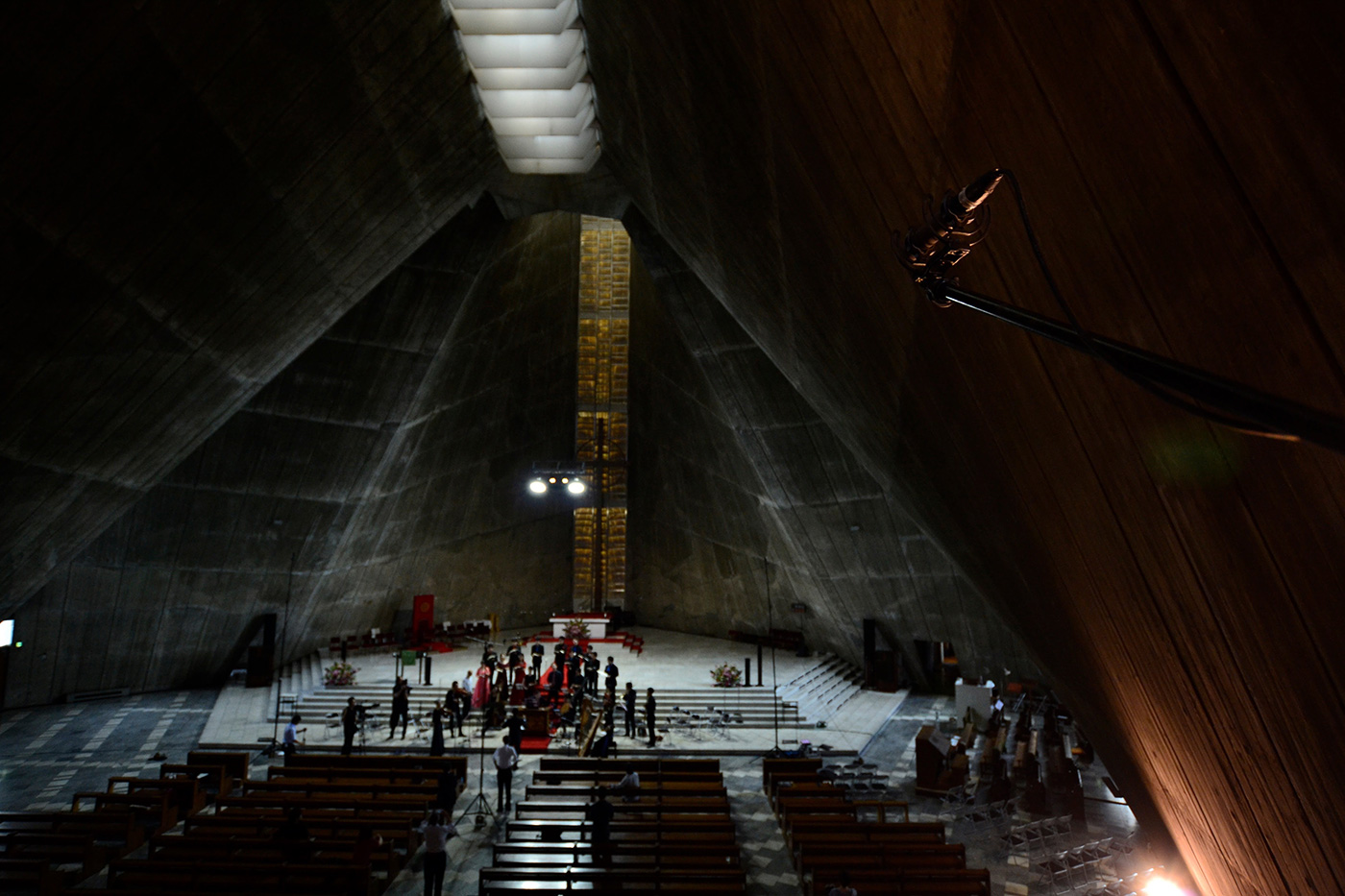 メインマイク メインマイクは、舞台に見立てた祭壇左右に2本のハイ・スタンドを設置し、さながら吊り橋のように各々のスタンドの先端の間に紐を渡し、その紐から電車の架線のようにクリップでマイクケーブルを吊るしてゆき、中央付近からマイクを垂らすという工夫を行った。