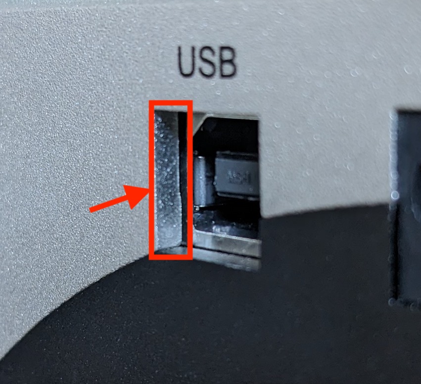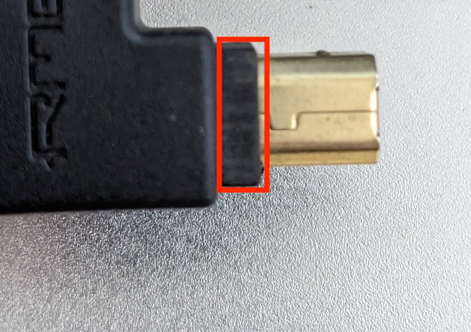 付属するケーブルのコネクタ部分にある一段太くなったラバー部分(下記写真左)が、本体側のUSB端子周辺の凹み(下記写真右)に一致します。このラバー部分と本体凹みによって脱落しずらい構造となっています。差し込みが固く感じられますが、きちんと奥まで差し込むようにしてください。