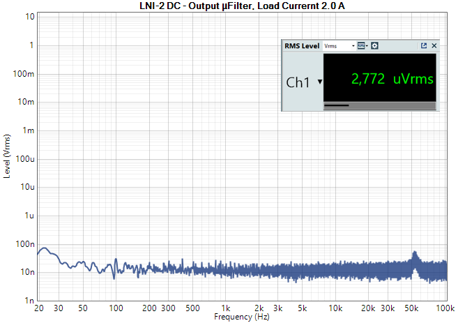 以下のグラフは、LNI-2 DCのDC出力を20 Hzから100 kHzまで周波数分析したものであり、通常のオシロスコープでは表示できないわずか数μVでも解析可能な測定器を使用した測定結果です。極めて低いノイズレベル*であることを示しています。